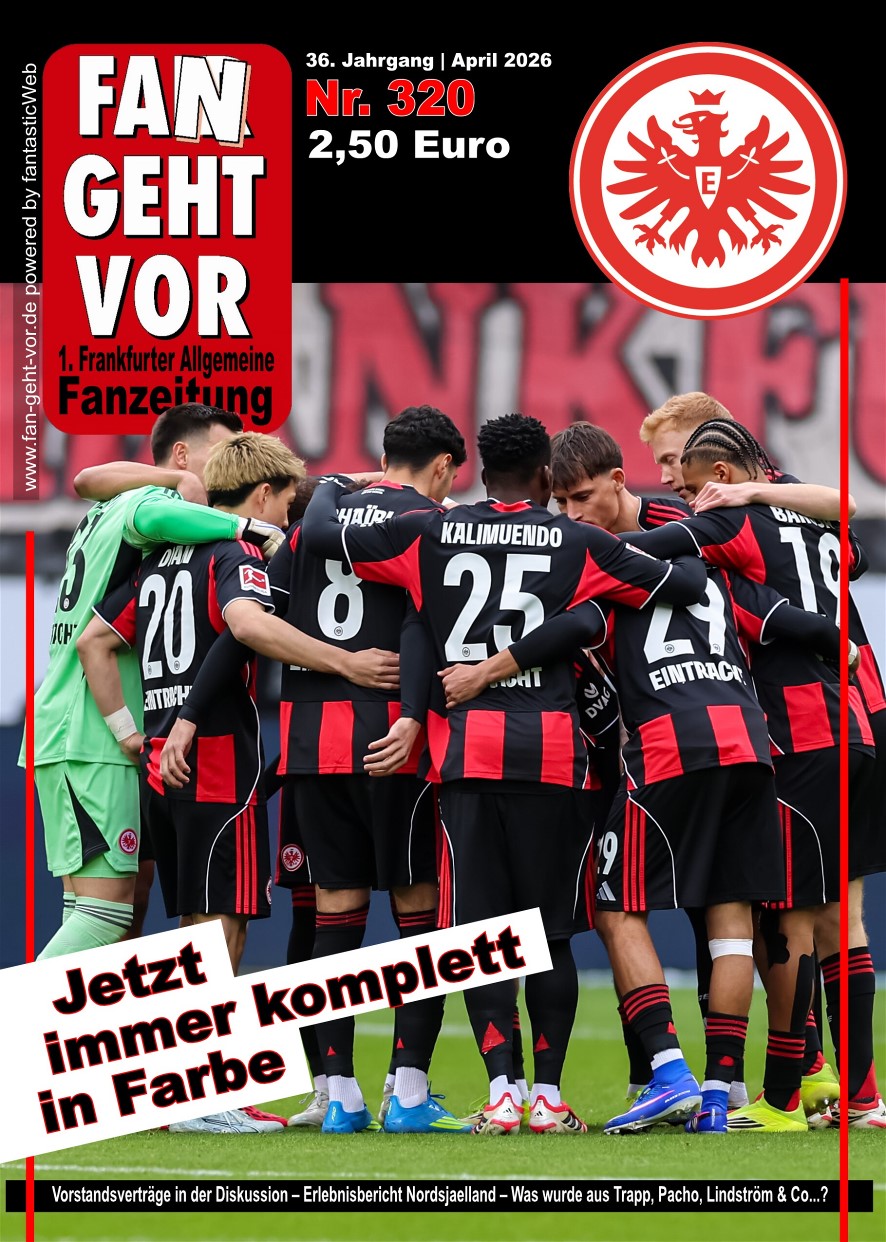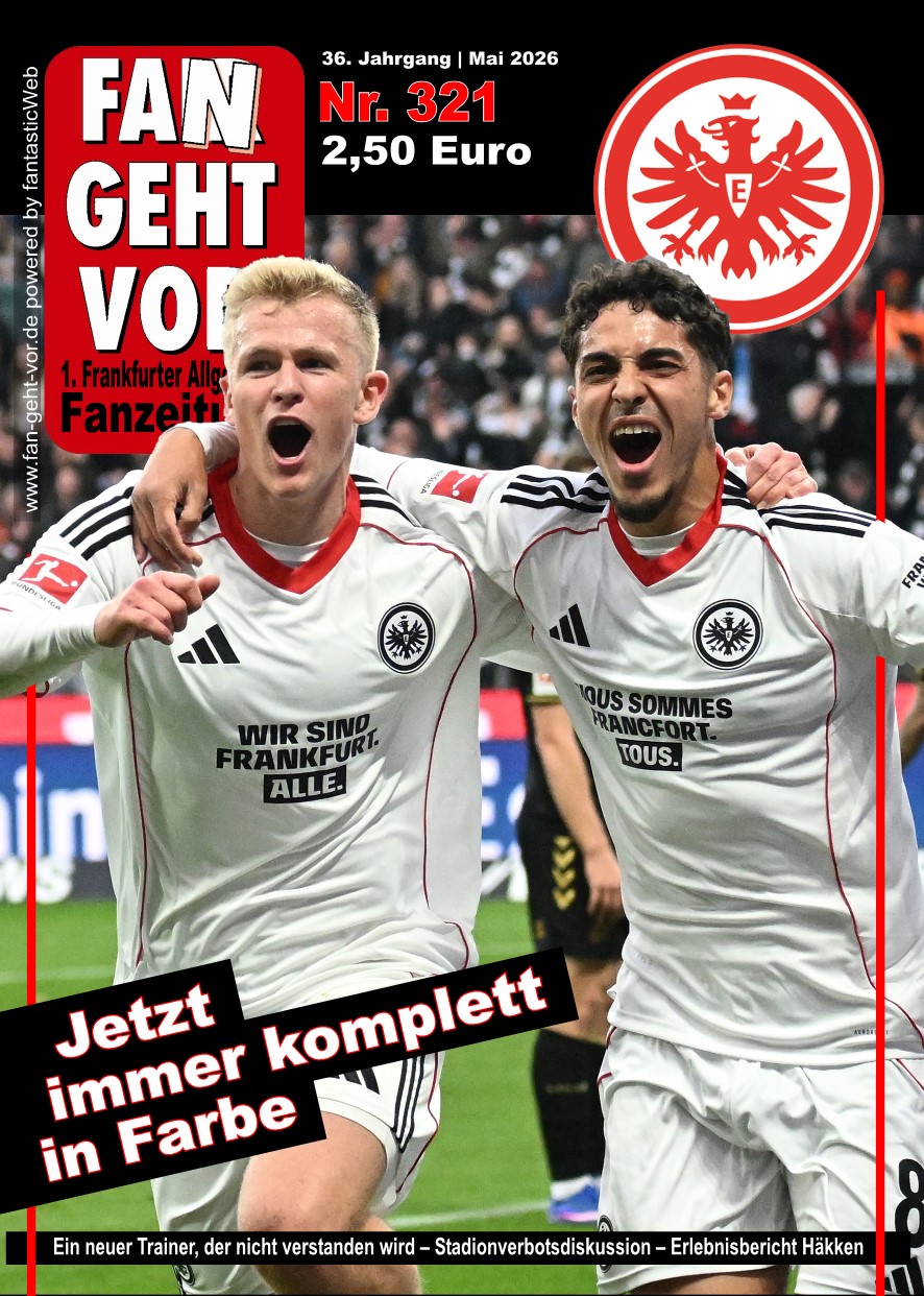 Ab dem Heimspiel gegen den 1. FC Köln ist unsere Ausgabe Nr. 320 in den Fanmobilen und in den Fanshops erhältlich. Sie kann im Abo, im Einzelversandverkauf, in den bekannten Verkaufsstellen und im Stadionverkauf an den Fanmobilen der Eintracht (sowie Fanshop) erworben werden - Handverkäufer auf den Wegen gibt es nicht mehr! Der Aboversand erfolgt am 1. April.
