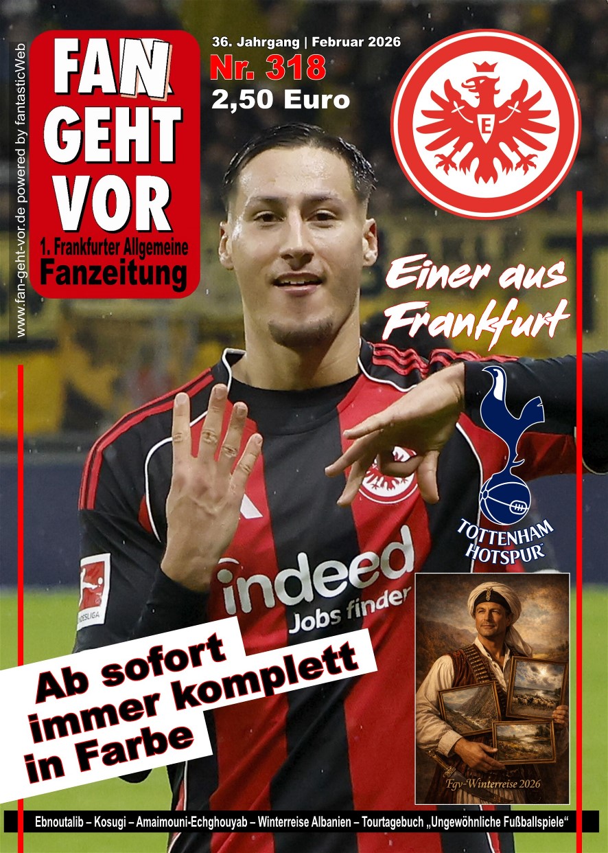 Ab dem Heimspiel gegen Tottenham ist unsere Ausgabe Nr. 318 in den Fanmobilen und in den Fanshops erhältlich. Sie kann im Abo, im Einzelversandverkauf, in den bekannten Verkaufsstellen und im Stadionverkauf an den Fanmobilen der Eintracht (sowie Fanshop) erworben werden - Handverkäufer auf den Wegen gibt es nicht mehr! Der Aboversand erfolgte am 23. Januar - Einzelheftbestellungen sind noch möglich.